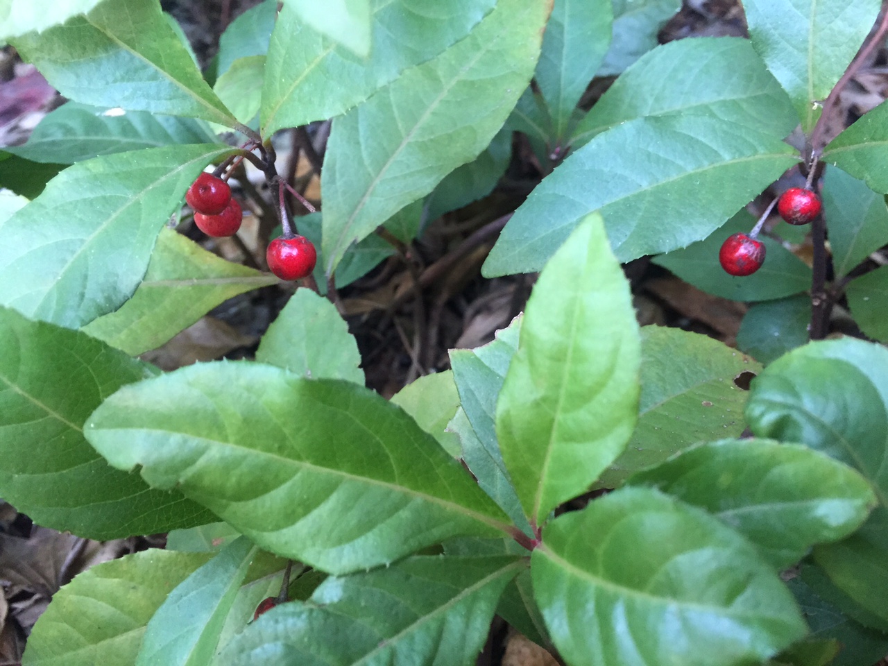 雑木の足元のヤブコウジの赤い実が一際輝いて見えます。